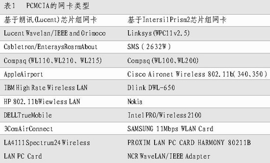 经过www.Linux.org认证的PCMCIA网卡有两大类,分别是基于朗讯(Lucent)芯片组的PCIMCIA无线网卡和基于Intersil Prism2芯片组的PCMCIA的无线网卡(见表1)。不过由于基于Intersil Prism2芯片组的PCMCIA的无线网卡价格比较便宜(相当于朗讯芯片组的PCIMCIA无线网卡的三分之一),所以国内的PCMCIA的无线网卡以后者居多。