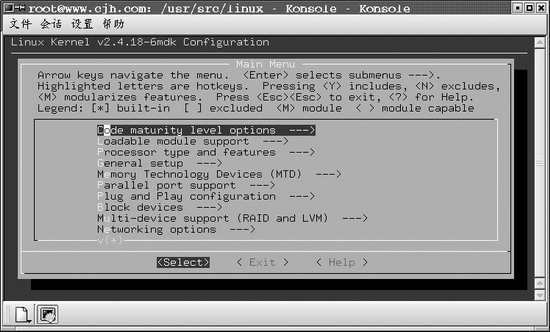 图3 menuconfig 配置界面 5.重新编译内核,并除去任何对内核提供PCMCIA驱动程序的部分。一般说来,在与其它程序和网络服务起作用时,PCMCIA-CS网卡服务库和驱动程序往往比基于内核的函数库更稳定,而且界面更友好一些。PCMCIA-CS源代码支持的网卡种类不断增多,附带的设备驱动程序的更新和改进通常比内核附带的驱动程序要快捷,运行也更稳定。另外正如前面提到的那样,如果需要构建/安装第三方驱动程序,那么在大多数情况下,该驱动程序需要安装并配置PCMCIA-CS库。从 Main Menu 转至 General setup→PCMCIA/CardBus support,将 PCMCIA/CardBus support选项由“yes”改成“no”(使用空格键将