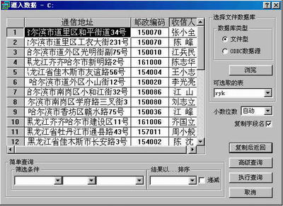 在灌入数据设置窗口中,可以选择要灌入的DBF数据的字段名称,在这里可以选择输入,通过按住CTRL键和鼠标点击字段名进行选择,选择后该列变为黑色,如果不需要调入的可以在按住CTRL键时用鼠标点击某一行最前方的数据按钮,如变为白色表示该行不调入,如果一个DBF数据库比较大时,也可以采取分段读取的方式,如先从1条200条,处理完毕后,再读取201到400条,以此类推至到全部数据读取完毕,同时也可以对数据表中的字段通过简单的查询,实现调入数据库内容的筛选,全部选择完毕后,鼠标点击复制后返回按钮,则能够将当前选择的全部数据将调到入到表格之中,参见图3所示。