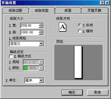 在这里要将纸张规格设为自定义,将纸张大小中的宽度值由要读取数据库中字段数决定,如读取一个人员通信录RYK.DBF数据库时,如果需要读取通信地址、邮政编码、收信人等字段信息时,由于要读取的字段数不多,宽度值设定可不需过大,这里一般可设为250毫米,高度值决定要提取DBF数据库的记录个数也就是表格的行数,所以一般来说,当记录数比较大时,可将高度值设为最大值,这里可设定的最大值为1000毫米,我们就把这个值设为1000毫米,确定后,一个新的空白页面就出现了。