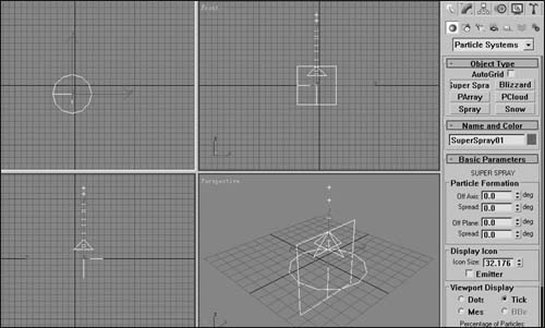 单击“Super Spray”按钮,在“顶视图(Top)”中按下鼠标左键并拖动,这时一个“Super