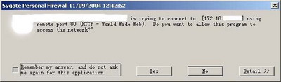 有些程序在你安装完之后,会连到网络去,这时候sygate personal firewall会弹出对话框,如果这个程序没有必要连接网络,建议不要让它连接网络,选no。如图。