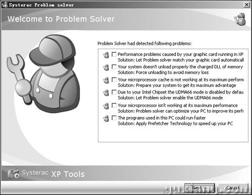 “故障解决”功能是Systerac XP Tools的一个特色功能,通过它你可以轻松地扫描出硬件设备存在的问题,并给出解决方案。单击“Problem Solver”,在弹出的窗口中单击“Next”,单击“Reset”按钮可以显示计算机的所有故障,甚至包括你已经解决了的故障,再次单击“Next”开始扫描,完毕后你就可以看到结果了。勾选所有结果项后继续单击“Next”,Systerac XP Tools会自动帮你修复这些问题。