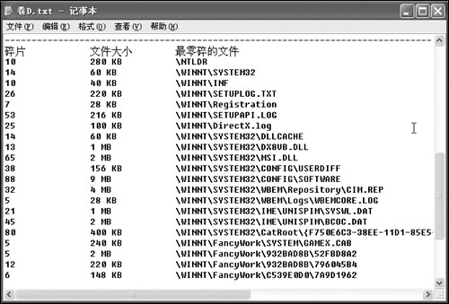 打开上面保存下来的分析报告文件(如果是D盘则为“卷D.txt”),下拉滚动条查看分隔线以下部分,这里列出了该磁盘分区中最零碎的文件。
