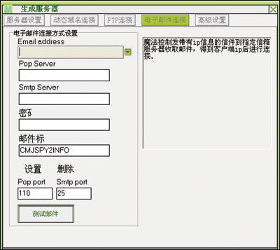 如果使用电子邮件连接方式,请选择电子邮件连接面板(图3),填写正确的电子邮件连接设置(到网上申请一个稳定免费的邮箱即可)。按[测试邮件]按钮,如果显示测试成功,表示该E-mail可用。然后在“服务器设置”面板里添加电子邮件连接方式即可。