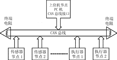 在对CAN总线接口的节点用户协议进行研究之前,有必要对整个网络结构有一个总体的认识。就现代工程机械而言,一般可把CAN总线网络中的节点分为3种类型:上位机节点、执行器节点和传感器节点,总线网络拓扑结构如图2所示。