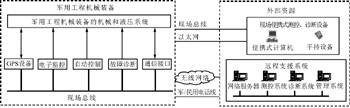 1 军用工程机械装备智能化、信息化体系 军用工程机械装备智能化是指:装备系统可以自动地完成对自身状态的调节、控制、监控与诊断,还可以及时地对外部指令作出响应,并完成一系列的指令动作;军用工程机械装备信息化是指:通过特定的方式将装备系统的静态参数、动态参数变成数字信号传递出去,使得其它系统可以共享该系统的数据以完成对装备系统的检测与控制。图1为典型的军用工程机械装备智能信息化体系的示意图。