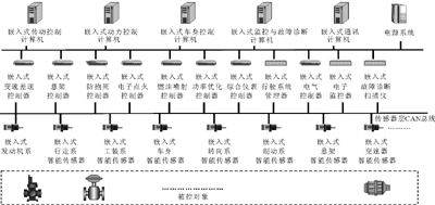 在实际应用中,我们曾选用PC-104主板作为嵌入式计算机系统的硬件,软件采用实时度很高的WindRiver公司的VxWorks操作系统,利用VxWorks BSP包完成移植。控制器系统的微控制器采用了TI的TMS320LF2407定点DSP芯片,使用源码公开的uc/OS-Ⅱ实时嵌入式操作系统作为嵌入式控制器软件内核。智能传感器的微控制器使用了由TI公司近年推出的专门用于智能传感器领域MSP430系列混合信号MCU,直接用MSP430的专业编程工具IAR C430编写应用程序,用JTAG完成程序下载与调试。 CAN总线组网的智能信息化装备系统有两层网络:传感器层和计算机层。传感器层CAN网络主要是给控制器提供装备系统的压力、温度、进气量、位移等参数,控制器接收到相应的传感器数据后进行运算处理或送交上一级计算机系统处理,控制运算完成后嵌入式控制器根据控制要求发出控制信号控制相应的执行元件实现机械、液压系统的控制。控制层CAN网络一部分用途是给计算机层提供控制模型所需的参数或直接将底层传感器数据传送,以便计算机及时地完成控制模型的运算和控制参数的输出。控制层CAN网络还用于计算机系统实现对装备系统的过程监控、故障诊断。控制层CAN网络实现了装备系统内部的计算机间的通讯,与嵌入式通讯计算机一起实现了军用工程机械装备系统与外部计算机系统的数据通讯,外部计算机系统可以取得传感器层、控制器层、计算机层三层的数据,极大地方便了外部系统不同层次的开发与应用。 CAN总线组网的智能信息化装备系统分为5个部分:传动控制系统、动力控制系统、车身控制系统、电子监控与故障诊断系统、通讯系统。各部分完成的功能和工作原理如下: (1)传动控制系统负责完成发动机输出动力传送过程中动力的分配、调节与控制。传动控制系统根据系统负载的变化精确地控制动力的传动比,以改善发动机的动力性能。同时通过对悬架系统、刹车系统的控制,进一步改善装备系统的行驶特性。传动控制系统由三个子控制系统组成:变速差速控制系统、悬架控制系统、ABS防抱死系统。