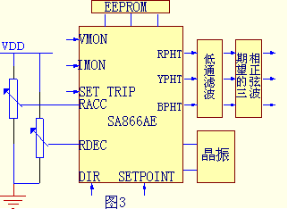 图1是SA866AE内部标准工作方式的框图。ADC是模数转换器,具有16位的精度,它将SETPOINT脚上的直流电压信号转换成相应的数字量控制PWM的输出频率,Vref是ADC的参考电压。DIR用于调节输出正弦波的相序。Vmon和Imon输入都是模拟量,起到保护的作用,它也可