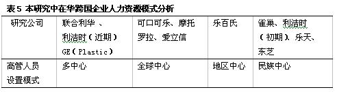 | 跨国企业人力资源管理一般分为4种模式:1 . 民族中心主义,即人员管理模式偏向母国模式,多在海外子公司的重要管理岗位上安置母国员工;2 . 多中心主义,子公司根据当地环境采取合适的人力资源政策,其重要管理岗位可以由东道国员工承担,这实质上是本土化的一种做法;3 . 地区中心主义,子公司按地区进行分类,子公司的管理人员由本地区任何国家的员工担任;4 . 全球中心主义,即在全球范围内配置母国人员、东道国人员和第三国人员。 成功的在华跨国企业都在采用哪些人力资源管理模式?为什么要采取这些模式?这些模式是否对走出去的中国企业有借鉴意义? 笔者以进入中国多年的10家《财富》五百强企业为研究对象,行业包括:快速消费品、电信、食品、家用化学品等。通过对这些公司的CEO或人力资源总监的访谈,得出以下看法。 基于成本考虑的本土化模式 有些跨国企业出于成本考虑采取了本土化的高管人员设置模式,这些跨国企业的本土化程度比较高。如:研究中的联合利华公司在高管人员设置上遵循中国子公司本地的人力资源管理习惯,公司主要雇用或选拔中国人作为高级管理人员(见表1),公司60%的高管人员是由中国人来担任的。不过联合利华公司认为为了更好地贯彻公司的发展战略和管理模式,子公司的总裁应由母国管理者承担,当地管理人员不应染指这一层次的管理职位,所以中国区的总裁还是由欧洲的本土人员来担任。此外,我们访谈的GE公司也属于该种情况。