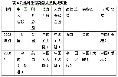 基于文化考虑的民族中心模式 与以往的研究结论类似,在华日本公司乐天和东芝都采取了民族中心的人力资源管理模式。其高管人员都是从日本公司本部派来的。所以在这两家公司的中层以下的本土管理人员流动性都极高,基本上很少有中层以下的管理者在公司连续工作两年以上的。这是中日文化差异、理念差异以及职业上的差异造成的。 民族中心型的模式是由来自母国的管理手段与文化主宰子公司的运营,只有母国的管理人员才是公司高级经理人员的首选。母公司对子公司员工严格控制,中国子公司的关键岗位(如:总裁、财务总监)均由母公司直接派遣,聘请的中国高级管理人员仅限于人力资源和信息服务部门,中国雇员普遍从事次要或辅助性的工作。员工的评价和晋升也采用母国标准。 不断调整的高管配置 很多跨国企业进入中国多年,在经营发展过程中高级管理人员的设置不断发生变化。如:英国的利洁时公司,其高管人员的构成变化(如表4)。