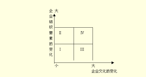 图中象限三是指企业实施一个新的战略,企业的组织要素变化不太大,但这些要素的变化却与企业原有的文化不太协调。在这种情况下,企业的高层管理者往往在生产经营中,在不影响企业总体文化一致的前提下,对某种经营业务实施不同的文化管理,但同时要注意加强全局性协调。因此,企业要对于企业文化密切相关的因素进行变革时,根据文化的不同要求进行分别管理是一个重要手段。
