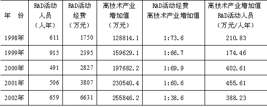 通过对连续五年来高技术产业的投入产出比较分析,我们可以得出结论:1998年广西高技术产业的R&D活动经费投入产出最高,其投入产出比为1:73.6; 2000年次之,其投入产出比为1:69.9;今年投入产出最低为1:38.6。今年每个R&D活动人员创造高技术产业增加值最高为455.61万元;其次是2000年,平均每个R&D活动人员创造高技术产业增加值为402.61万元;1999年平均每个R&D活动人员创造的增加值最低为174.46万元。今年平均每个R&D活动人员创造的增加值最低为388.23万元。从高技术产业R&D投入产出情况分析,可以看出,广西技术产业R&D人力和经费投入规模偏小,由于广西高技术R&D投入的整体规模不大,因此广西高技术产业的整体规模也相应偏小,拥有自主知识产权的产品少,附加值较低,由此导致广西高技术产业的总体竞争力不强,与全国先进水平尚存在较大差距。