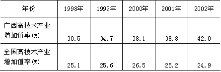 (二)广西高技术产业增长速度。广西高技术产业企业数由1998年的163家增至今年的176家,从业人员数基本保持稳定。广西高技术产业发展迅速,今年工业高技术产业产值为98.11亿元,比1998年增长107.5%,高于同期广西工业总产值(不变价)增幅34.4个百分点;高技术产业年平均增长21.5%,高于广西工业总产值(不变价) 同期增幅9.3个百分点。
