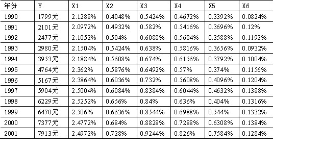 (注:表中Y为新疆人均国内生产总值;x1为新疆人均国内生产总值与全国的比值;x2、x3、x4、x5、x6分别为新疆交通运输设备制造业的企业数、职工人数、固定资产净值、工业总产值、税前利润与全国的比值。