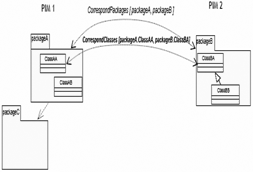 (1)通信规则。通信规则定义的是构成模型的同类型元素,即包与包、类与类等等相互之间怎样发送和接收消息产生的交互影响,此时,参与通信的双方来自不同的PIM模型。