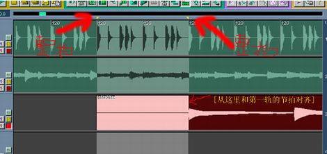 用鼠标左键在该波形上,划出2个小节,以第一轨的节拍为尺度,非常方便并且绝对准确,不会有任何偏差.如果觉得看的不清楚,可以再横向放大一些.