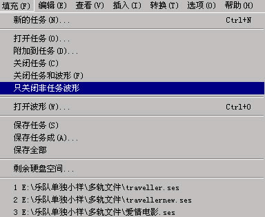 每次你要在Cool Edit中打开这首歌的多轨编辑模式时,在"文件"菜单下选择"打开任务",然后选中你保存好的.ses文件,所有的波形文件会自动加载,并保持你保存过的状态.