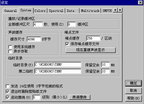 在这里可以调节临时文件的存放位置和大小,播放/录音缓冲区的大小和数量,软件视图的颜色方案,采样质量级别,默认的录,混音的样本率,以及系统的播放/录音设备选择等等.