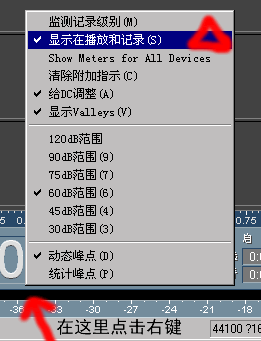 Cool Edit Pro在播放音频时,下面有红色的电平表显示.经常有朋友问我,重装软件后那个电平显示不出来了,该怎么办?非常简单,只要在那个本该显示电平的地方点击鼠标右键,选中"显示在播放和录音",使的该项前面有打勾记号,电平表就会出现了.如图: