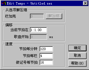 在"查看"菜单下,"显示时间格式"子菜单里,进入"编辑速度"(Edit Tempo),在对话框里填入歌曲的速度值和节拍.如图: