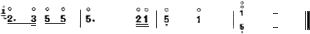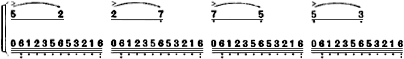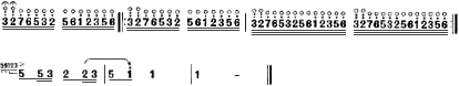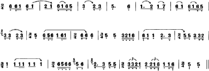 第二部分,包括第四、五两段,是用按音演奏的曲调,是乐曲的展开部分。以第五段音乐为例: