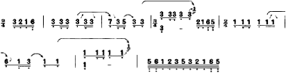 第三部分,由第六、七两段组成,就是张孔山增加的著名滚、拂段落,实际上也是乐曲的华彩部分。第六段旋律性较强,多由一对对称的乐句作反复、变化。如: