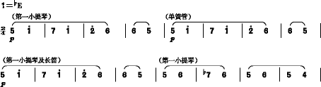 这段旋律依然有进行曲的特征,但它更富于歌唱性,好像人们在歌唱着胜利、赞颂着英雄。大家都沉浸在胜利的喜悦之中。