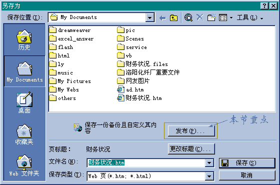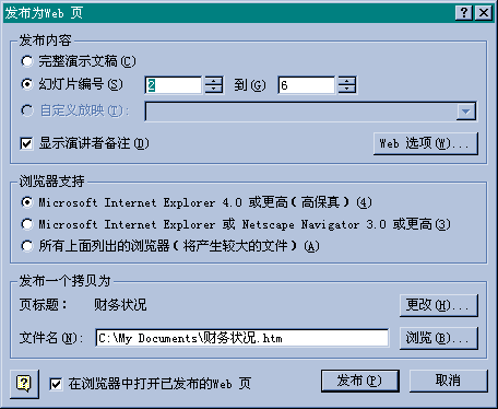 在“发布一个拷贝为”中有更改WEB页标题的“更改”按钮,这个按钮的功能和图一中的功能是完全一致的,在其下面的“文件名”中,显示的路径就是,要保存的网页发布的路径,我这里显示的是本地硬盘的路径,当然也可以保存到网络的某个服务器中。