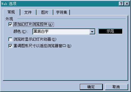 在上图的最下方有一个复选框“在浏览器中打开已发布的WEB页”即当您点击“发布”另存之后,自动打开生成WEB页,以浏览器的方式查看刚刚生成的POWERPOINT网页。在上图对话框中, 我重点要讲一下,“WEB选项”当我们点击它的时候,弹出一个“WEB选项”对话框,它有四个标签分别是“常规”、“文件”、“图片”、“字符集”所有网页上的参数都可以在这里得到有效的管理,在“常规”标签中我们可以看到三个复选框,“添加幻灯片浏览控件颜色”,默认状况是“黑底白字”还有“白底黑字”,等五个选项请根据幻灯片的总体背景颜色来协调选择即可,我在这里就不多说了;“浏览时显示幻灯片动画”默认则是没有被选中的,因为这个功能只有在IE4.0以上的版本才可以正常观看POWERPOINT的动画及幻灯片的切换,所以这个复选框在选择上一定要慎重!否则如果使用IE4.0以下的版本将无法正常浏览!“重调图形尺寸以适应浏览器窗口”这个复选框也需要IE4.0也上版本的支持!