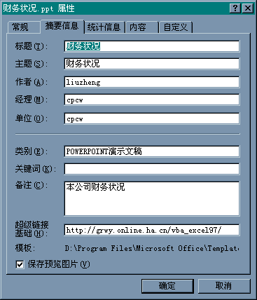 “属性”对话框:主要是为了更好的管理POWERPOINT文稿而设计的。