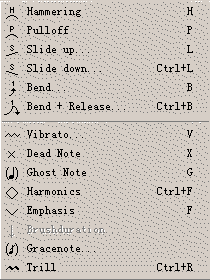 在TABAZAR的EFFECT菜单下我们可以找到这些演奏技巧(如图4)。它们包括:HAMMERING表示捶弦/钩弦、SLIDE UP/DOWN是上滑弦和下滑弦、BEND推弦、VIBRATO左手颤音、GRACE NOTE装饰音、HARMONIC泛音、DEAD NOTE闷音等等,在选择了一种技巧之后会弹出它的设定窗口进行具体设定,全赖你的需求了!