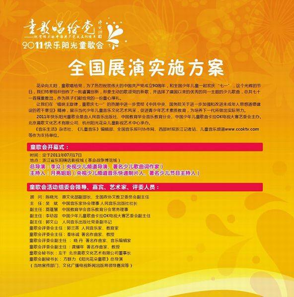 让我们在“唱响主旋律,童歌庆七一”的热潮中进一步贯彻《中共中央、国务院关于进一步加强和改进未成年人思想道德建设的若干意见》精神,展示当代少年儿童音乐文化艺术风采,促进青少年艺术素质教育,为培养下一代所做出实际努力。