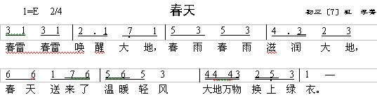 也有部分同学不能正确的记录自己的作品而急,我就安排记谱较好的同学帮助他们记谱,这样既锻炼了学生的能力,也激励了他们学习的积极性。当我把部分作品介绍给九年纪的同学时,也激励了他们的创作热情,以下是李菁同学创作的《春天》,只做了小小的修改。