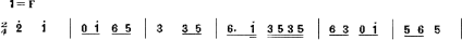 这是由清脆明亮的曲笛吹出的京剧曲牌,给人以明朗、轻松之感。过门乐句之后进入中段,由曲笛吹出了新的模仿唱腔的曲调: