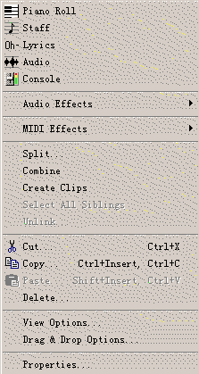 我们选择一段MIDI事件并用鼠标右键调出快捷菜单,这里面常用的编辑窗口中没有了STUDIO WAREZ调音台控制、和EVENT LIST事件列表,这两个窗口正是CPA中预留给高级用户使用的,对于初学者来说,没有太大的实用性,所以CMC中就毫无保留地去掉了它们!选择PIANO ROLL进入钢琴窗口,这里的选项与CPA没有什么不同,因为钢琴窗口是CAKEWALK最方便的编辑界面,无论是对老鸟还是菜鸟来说都应该熟练掌握!我们用鼠标在适当的键盘位置上添加、修改音符,并可以在下方的力度窗口中改变每个音符的力度值。按下右上角的SNAP TO GRID按钮设定一个最小的音符单位,所有的操作就会以它为标准了,这样给音符的调整带来很大方便。同样,PICKTRACK可以让你在一个钢琴窗口中同时显示多个轨道的音符数据,非常直观,更加便于操作!当然选择STAFF可以进入五线谱窗口,对熟悉五线谱的朋友很有帮助,音符编辑、表情符号、多轨显示等功能应有尽有,只是去掉了CPA中不常用的吉他和弦显示,不会对操作带来什么影响!歌词窗口和控制窗口也是常用的编辑界面,根据用户需要合理地调整,最后将它们关闭,回到主界面!