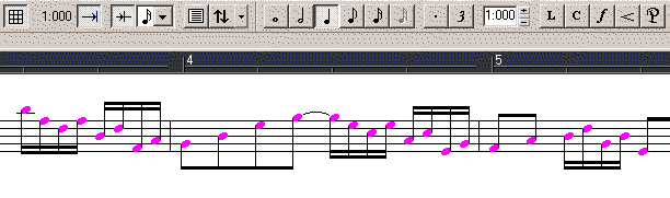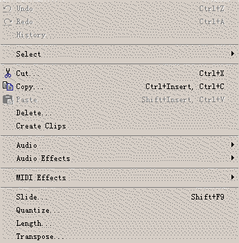 EDIT菜单下,CMC为我们提供了最常用的几种编辑命令,与CPA相比虽然简化了很多,但对普通用户来说,功能却没有受到限制!在每一次的MIDI输入录制结束之后,都需要对输入的音符进行量化,使其音符长度更加统一,结构更规范!选择EDIT下的QUANTIZE后设定一个量化的尺度,按下OK键就可以了,现在看看刚才的音符,是不是整齐多了!同样,用EDIT下的SLIDE可以对一段MIDI事件进行移动,并可以选择移动的单位;用LENGTH调整一段MIDI事件的长度,可以以原来长度的百分比进行拉伸或缩短;而TRANSPOSE可以对音轨进行转调!EDIT下的这几个命令对初学者来说有很强的实用价值!它提供了最基本、最常用的修改编辑方法,需熟练掌握!