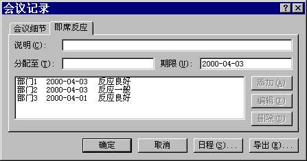 关于“绘图笔”我还要和大家说一些关于如何改换颜色的方法:在“幻灯片放映”视图中我们单击鼠标“右键”在弹出的对话框中找到“指针选项”—“绘图笔颜色”—然后单击一种颜色之后我们就可以使用不同颜色的绘图笔在屏幕上写板书了。如果你认为板书需要擦除的时候可以单击键盘上的“E”键将板书完全擦除。在“幻灯片放映”视图中,我们还要讲一下如何制作“会议记录”和打开“演讲者备注”,方法都是单击鼠标右键“会议记录”单击,在弹出的对话框中输入“会议细节”和“即席反应”,我们先讨论一下如何使用“会议细节”,当我们单击这个标签后,我们可以在它的文本框中输入一些会议纪要,然后单击“即席反应”标签,输入“说明”内容,“分配至”某个单位,输入期限后,就可以添加到下面的清单框中了,如图(2)所示,在这个对话框中我们可以添加“即席反应”也可以对它们进行“编辑”和“删除”,还可以“导出”到WORD或OUTLOOK中,方法都是十分简单的,只要你按照步骤一步一步完成即可。好了在这一节中,我们已经基本上讲完了,POWERPOINT2000“视图”菜单中的所有命令。
