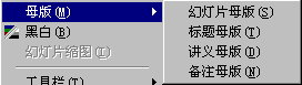 首先我们点击菜单“视图”—“母版”在这图(3)中我们可以看到“母版”中还包括有四个子菜单“幻灯片母版”、“标题母版”、“讲义母版”、“备注母版”,前两种母版是针对于幻灯片放映时调整的,而后两种母版是针对于打印设置的,如图(4)所示的,关于幻灯片的这四种母版的具体使用方法,我们将在下一节做详细的讨论!