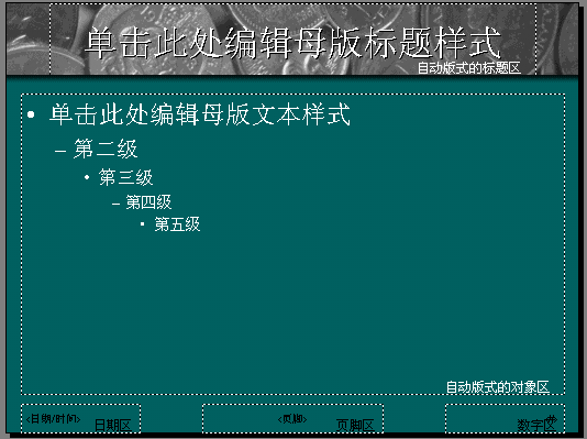 幻灯片母版包含文本占位符和页脚(如日期、时间和幻灯片编号)占位符。如果要修改多张幻灯片的外观,不必一张张幻灯片进行修改,而只需在幻灯片母版上做一次修改即可。在POWERPOINT2000中将自动更新已有的幻灯片,并对以后新添加的幻灯片应用这些更改。如果要更改标题格式,可选择占位符中的文本并做更改。