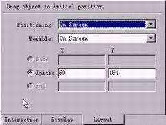 ·选择【On Screen】选项,如上左图所示。〖Initial〗区域中的值是交互作用显示的对象在屏幕中的位置。我们可以手工输入数值,或通过用鼠标拖动对象到合适位置,该区域的值随对象的移动而改变。