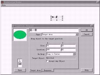 双击程序流程线上的响应类型图标,弹出图所示的【Properties:Response】对话框,在〖Type〗选项列表中选择〖Target Area〗目标区,如图所示,目标区是中间有交叉线的虚框线,目标区的位置就是展示过程中最终用户要放置显示对象的正确位置。