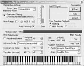 单击“Convert WAVE file to MIDI track”按钮,弹出格式转换参数设置对话框,在“Recognition”中选择声音格式类型,然后单击“Start”按钮开始进行文件格式的转换(如图2)。