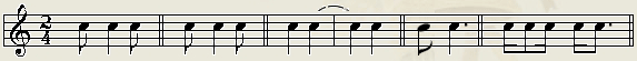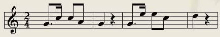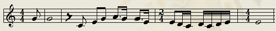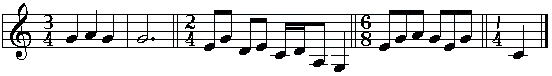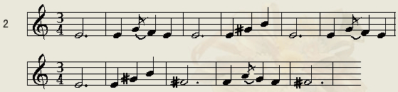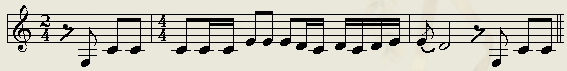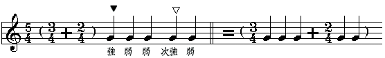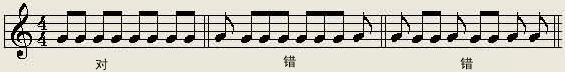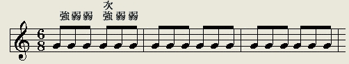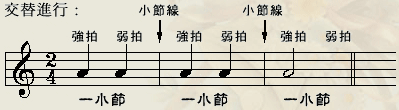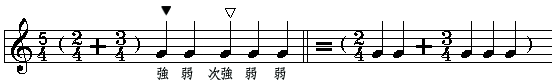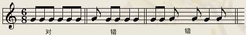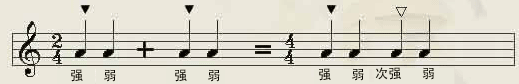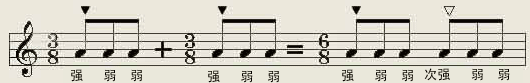 注:混合拍子中在每小节里只可以有一个强音,因此第二组或第三组的强音都只能屈居次强音,不能称强音。