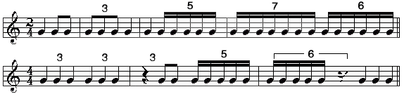 一般连音符的数字的标写方法只在符尾处写上数字就可以了,是几连音就写几,如果出现休止符就要在数字的两边画上连线,以示这休止符和音符之间的关系,但是要跨在一起。(见前图 — 最后一小节)