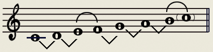 这C调是自然音阶,是由大二度、大二度,小二度大二度,大二度,大二度小二度组成的(注:V 大二度 、∩小二度)。