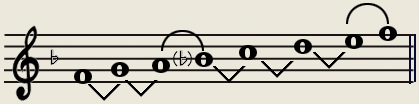 Fa到so是大二度,So到La是大二度,而La到Si还是大二度,但三级音到四级音应该是小二度,怎么办呢,同样的把Si降下半个音,就成为小二度,而降Si到Do正好是大二度,符合要求,其它音不动,因此这里面就有了一个降Si,因此F调的调号上就出现了一个降Si,也就是说在F调里如果没有其它要求的话所有的Si都要降半个音,用降Si。