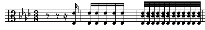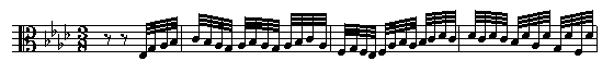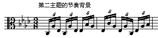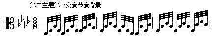 到第98小节的最后一拍,开始第一主题的第二变奏部分,把主题进一步变碎,连续不断的32分音符旋律(例六)在拨弦和节奏和弦的伴奏下具有激动不安的性质。
