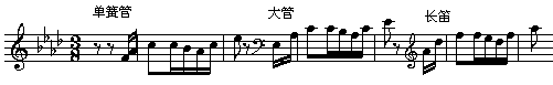 从第22小节的最后一拍开始,由单簧管和大管奏出第二主题(例二):