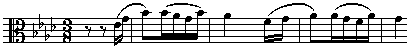 第二乐章是双主题变奏曲式。这一乐章具有描写内心境界的性质。刚开始是降A大调,3/8拍,稍快的流畅的行板,从第1小节到第9小节,由中提琴、大提琴奏出第一主题(例一):